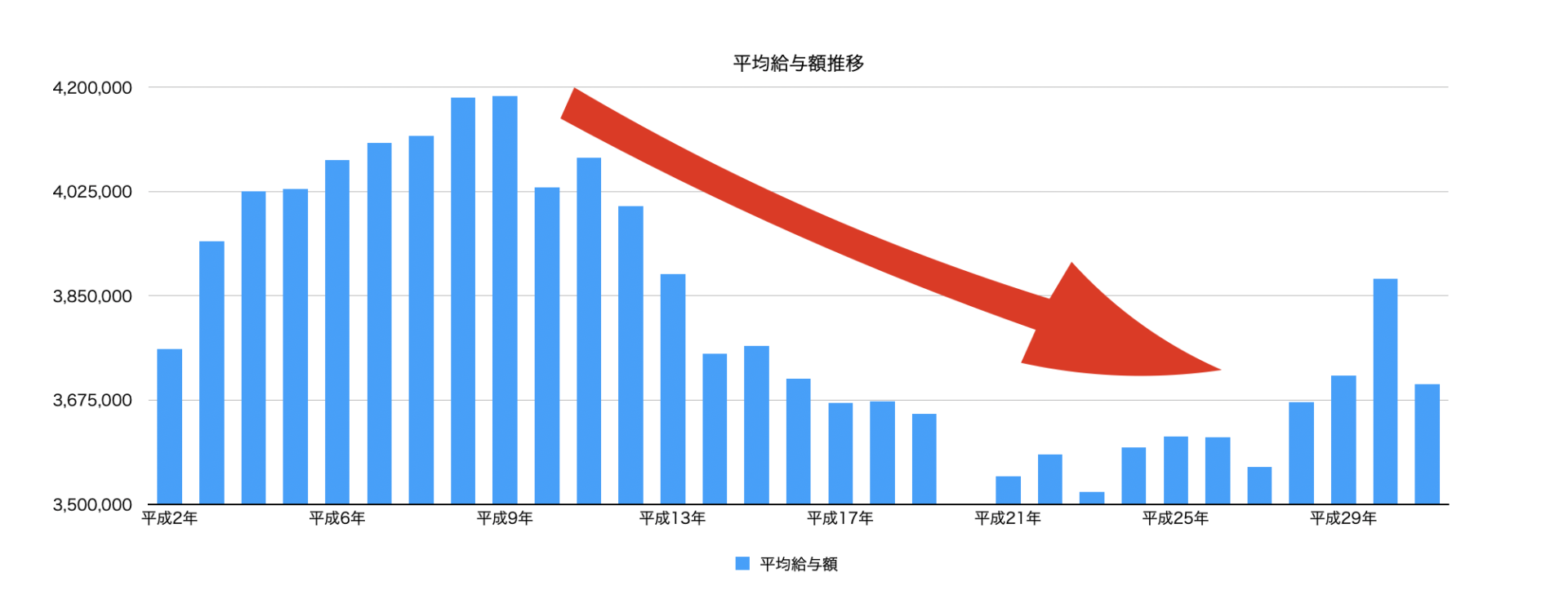 こちらは国税庁のデータをもとに作成した民間の平均給与推移グラフですが、平均収入は右肩下がりです。